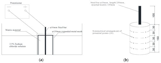 According to the experimental results of Jianming’s mixture ratio design for magnesium phosphate cement-based materials, the potentiostatic accelerated corrosion grouping method, as shown in Table 9, was used to compare the protective properties of magnesium phosphate cement-based materials for steel reinforcement.