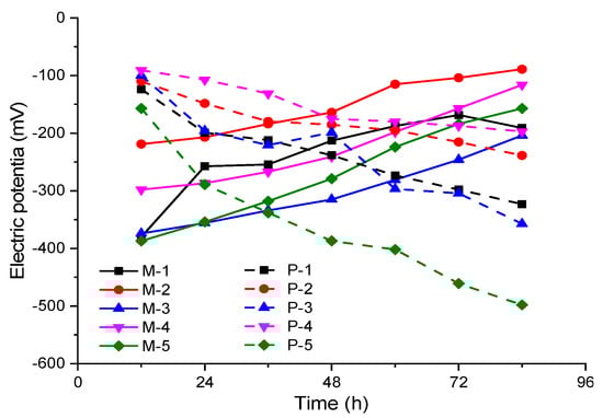 The specimen potentials tested by the half-cell method are shown in Figure 21. The characteristics of the potential curve demonstrate that as the corrosion time increased, the potentials of the OPC slurry decreased, and corrosion probability increased, while the potentials of the MPC slurry increased. The initial potential of the MPC material was −200 to −400 mV. However, the steel did not corrode at first. With an increase in electrical time, the surface of the steel in the MPC material formed a non-conducting iron phosphate film, which increased the corrosion potential. From this perspective, electricity can improve the corrosion resistance ability of steel.