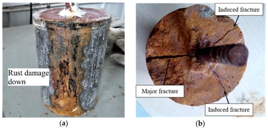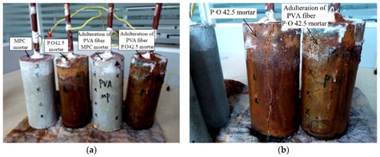The experimental specimens of M-1, P-1, M-5, and P-5 are shown in Figure 22. The protective performance of the Portland cement mortar to the steel bar was obviously worse than that of the MPC mortar under the same accelerated corrosion conditions. Because of the rust expansion of the steel bar, the cracks in Portland cement mortar specimen occurred from the center to the edge, as well as up and down. Figure 23a shows that the steel bar in the Portland cement specimen accelerated corrosion through a relatively large crack in the matrix and gradually expanded the range of rust expansion from that point downward. Figure 23b shows the reinforcement of the fiber with the cement matrix material. When the first crack appeared in the cement matrix due to the rust expansion of the steel bar, the fiber continued to prevent further expansion of the crack. However, the rust expansion stress of the steel bar continued to increase, thus cracking at the second weak point of the cement matrix. As a result, the fiber-reinforced OPC mortar resisted more corrosion expansion energy and optimized its cracking mode.