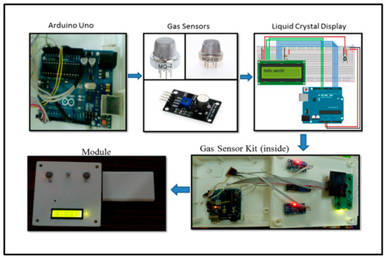 To materialise the idea of the portable gas sensor module, a systematic design and development of the sensor unit was conceptually made into three separate parts, which were then combined to make a unified sensor unit. The unique combination of (a) design, (b) hardware (electronic circuit), and (c) software are described below to build the prototype (Figure 2).