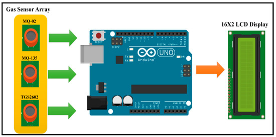 There is a variety of individual gas sensors commercially available on the market. For example, in the present study, we have used MQ-02, MQ-135, and TGS2602 commercial gas sensors. The MQ-02 sensor is used in gas-leakage-detecting equipment in domestic and industry settings and is suitable for detecting LPG, i-butane, propane, methane, alcohol, hydrogen, smoke. The structure and configuration of the MQ-2 gas sensor is composed by micro alumina—Al2O3 ceramic tube, SnO2 sensitive layer, measuring electrode and heater are fixed into a crust made by plastic and stainless steel net. The heater provides necessary work conditions for work of sensitive components. MQ-135 is an air quality sensor for detecting a wide range of gases, including NH3, NOx, alcohol, benzene, smoke and CO2. Ideal for use in office or factory. The MQ135 gas sensor has a high sensitivity to Ammonia, Sulfide and Benzene steam, also sensitive to smoke and other harmful gases. It is with low cost and particularly suitable for Air quality monitoring application. The TGS 2602 has a high sensitivity to low concentrations of odorous gases such as ammonia and H2S generated from waste materials in office and home environments. The sensor also has a high sensitivity to low concentrations of VOCs such as toluene emitted from wood finishing and construction products.