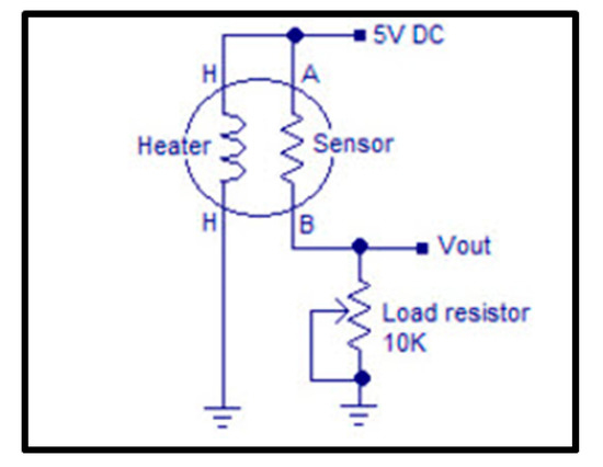 The signal conditionaing of the sensors used in the prototype development, is as follows. All the used sensors give change in resistance according gas concentration in ppm. For signal condition resistance to voltage, the simple voltage divider circuit idea is used where a gas sensor along with load resistance is used, which converts resistance to voltage. Sensor MQ-02 is connected to ADC pin A0, MQ-0135 to ADC pin A1, and TGS2602 to ADC pin A2. Figure 4 and Figure 5 show the common signal condition circuit of MQ-02, MQ-0135 and TGS2602 sensors. The calibration equation of MQ-02, MQ-0135 and TGS2602 sensor is: