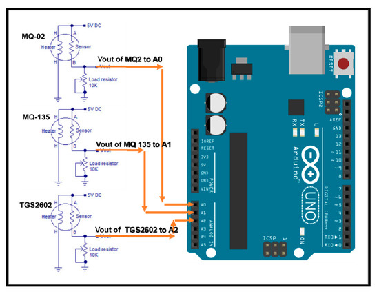 Figure 4 highlights the signal conditioning and interfacing of all the gas sensor with Arduino Uno. The Gas Sensor MQ2 module is useful for gas leakage detection (domestic as well as industry). It is suitable for detecting hydrogen H2, liquefied petroleum gas LPG, CH4, carbon monoxide CO, and alcohol. Due to its high sensitivity and fast response/recovery time, quick measurement records are possible. MQ-135 is an air quality monitoring sensor for detecting a wide range of gases, including ammonia NH3, nitrous oxide NOx, alcohol, benzene, smoke, and CO2. The TGS 2602 has high sensitivity towards low concentrations of odorous gases such as ammonia and H2S generated from waste materials. The sensor also has high sensitivity towards low concentrations of volatile organic compounds such as toluene emitted from wood finishing and construction products. The sensitivity of all these sensors can be adjusted by potentiometer. All the used sensors respond in term of “change in resistance” according to the aformentioned gas concentrations in ppm.