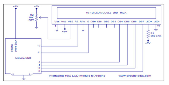 A typical LCD display consists of 16 pins that control various features of the screen. A schematic of the pinscan be seen in Figure 6 below. The Arduino microcontroller can output voltages of either 5 or 3.3 V, so the LCD can be powered by wiring VSS and VDD to the ground and 5 V pins on the microcontroller. It is possible to adjust the contrast of the screen by wiring a variable resistor to V0 located at pin 3 on the screen. The RS, R/W, and E pins are wired to pins 12, ground, and 11, respectively, on the Arduino. The LCD screen can operate in both 8-bit mode and 4-bit mode.