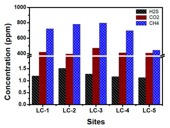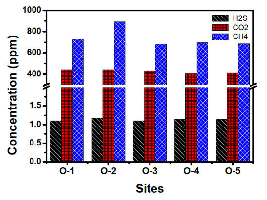 Figure 8 and Figure 9 highlight the gas sensing analysis of the developed mobile module both at large container dumping sites (Figure 8) as well as open sites (Figure 9). Within the scattered selected areas, the diversity in the production of greenhouse gases has been observed. The developed mobile module proved its measurement sensitivity in three different ranges: very low (for H2S: ~1 ppm), moderate (for CO2: ~400–500 ppm), and high (for CH4: >700 ppm).
