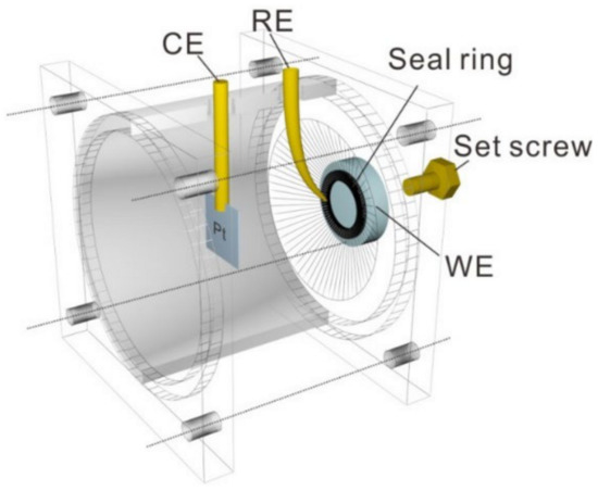 Electrochemical polarization experiments were performed in 1 mol/L HF solution to evaluate the corrosion resistance of the specimens by using an electrochemical workstation (CorrTest CS350, Wuhan, China). As shown in Figure 1, an electrolytic cell mainly composed of PTFE was designed for electrochemical testing. The nitrided specimen can be easily installed on the device without any epoxy resin and mechanically sealed using a fluororubber seal ring, leaving an area of 1 cm2 exposed to the electrolyte. A saturated calomel reference electrode (SCE) was connected to the cell through the Luggin capillary made by PTFE. A Pt sheet was used as the counter electrode.