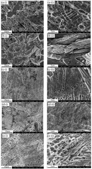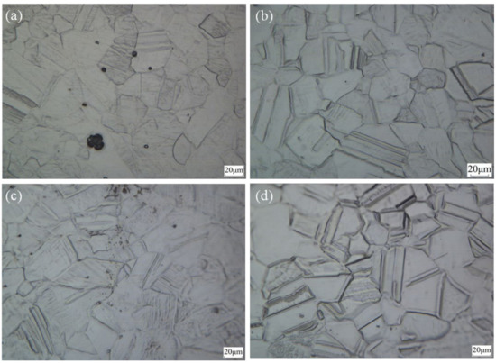 The metallographic morphology was characterized through an optical microscope (GX51, Olympus, Tokyo, Japan). The illuminant of the OM was 6v30whal halogen lamps and reflective light mode was operated. The microstructure and was characterized through the scanning electron microscopy (SEM, ZEISS SUPRE40, Jena, Germany). The accelerating voltage was 10 kV, and the mode for SEM observation was InLens (an imaging method for receiving SE1 signals proposed by ZEISS Company).
