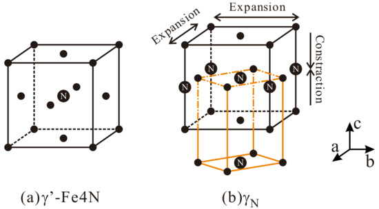 The XRD spectrums of the specimens are shown in Figure 4. The diffraction peaks of γN(111) and γN(200) at 40.02° and 45.28°, respectively, were ascribed to the expanded austenite [15]. The N dissolved in the interstitices of the solid solution distorted the lattice structure of austenite, resulting in the shifting of the γ(111) and γ(200) diffraction peaks to a low reflection angle. As shown in Figure 5, the γ’-Fe4N phase was a face-centered cubic (fcc) structure, and the γN phase was an N-saturated austenite, which was a face-centered tetragonal (fct) lattice structure derived from fcc cells [22]. The dissolved N atoms located at the center of the cell and at the middle positions of the four c axes deformed the cell through a slight expansion in the a/b direction and corresponding concentration in the c direction relative to those in the unit cell of γ’-Fe4N [22].