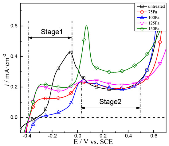 The anodic potentiodynamic polarization curves of 904L specimens in 1 mol/L HF solution treated at different NH3 pressures were measured. Results are shown in Figure 6. The anodic passivation behavior of treated specimens was remarkably different from that of the untreated bare metal. The untreated specimen exhibited the typical passivation curve of a stainless steel that included active dissolution and passivation ranges. By contrast, the nitrided specimens underwent two stages of passivation: The first stage (Stage 1) occurred over the potential range of OCP to −0.02 V vs. SCE. The increase in anodic current was inhibited compared with that in the active dissolution current of bare metal. The second stage (Stage 2) occurred over the potential range of 0.02 to 0.50 V vs. SCE. This range overlapped with the passivation range of the untreated specimen. Therefore, the inhibition of the activated current at Stage 1 was attributed to the blocking effect of the nitriding layer, which considerably decreased the maximum current for passivation. Moreover, given that the potential entered the passivation range of bare 904L ASS, the second decrease in anodic current at Stage 2 was due to the passivation of the base metal under the nitriding layer.