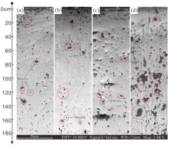 The cross section morphology of the specimens after 72 h of immersion in 1 mol/L HF is shown in Figure 9. In order to maximumly preserve the fragile structure of the corroded nitriding layer, the cross section of specimens were polished with argon ion. As can be seen, there was a larger amount of defect of cavities in the nitriding layer; the statistic results as shown in Figure 10. This phenomenon indicated that the nitriding layer behaved like a porous medium when immersed the HF. Therefore, the compactness of the nitriding layer dominated the corrosion resistance in HF. As shown in Figure 9b, the nitriding layer formed under 100 Pa exhibited the best compactness, especially at depth region near 70 to 120 μm, less defect of cavities blocking the diffusion path of the aggressive ion. Compared with the nitriding layer at 100 Pa, the amount and diameter of cavity was significantly increased in the nitriding layer at 125 and 150 Pa. This results indicated that the excess pressure of NH3 deteriorate the protection properties of nitriding layer by accelerate the localized corrosion in the nitriding layer as mentioned above.