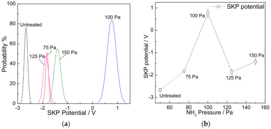 Statistical results of the SKP results of the untreated and the nitrided 904L specimens. (a) potential distribution; (b) average potential change with pressure of NH3.