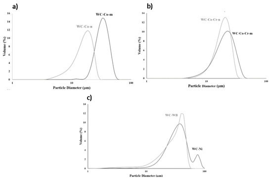 Figure 1, respectively. This comparison shows that the powders mainly resulted to have a homogeneous distribution, as expected for commercial feedstock materials. Nonetheless, some differences can be found regarding powder properties depending on the feedstock material composition. Thus, WC-Co (micro and nanometric) revealed a relevant difference in their mean particle size of these powders, which shows as the particles of the WC-Co-m powder are larger than that of the WC-Co-n material. In addition, the nanometric powder showed a narrower size distribution than the micrometric one. No relevant differences were observed between powders WC-Co–Cr-m and WC-Co–Cr-n, which resulted in almost equivalent distributions with similar mean particle size values, as it can be seen in