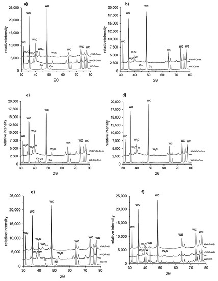 Figure 3). As expected, all the coatings were composed mainly of the phases also identified in their respective powders, that is, WC as ceramic phase and their correspondent metallic pure phases as matrix. In agreement with previous results, HVAF coatings showed little or none undesired phases, while some HVOF coatings suffered relevant decarburization. Thus, in the case of the HVOF coatings patterns, the presence of W