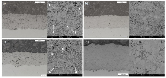 Figure 4 shows representative polished cross-sectional recorded by optical microscopy (OM) (left) and SEM (right) images of the coatings, while