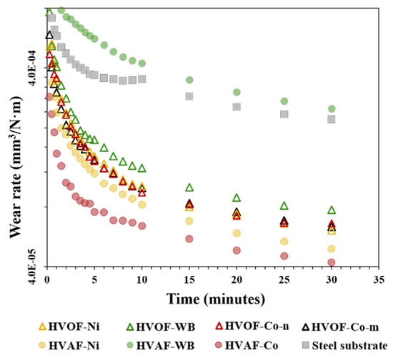 Figure 5. In this plot, it is observed, within the first minutes of the test, that the wear rate significantly dropped due to the rapid decrease of the roughness of the coatings. The ones that presented higher roughness values (HVAF-Ni and HVAF-WB) showed a steeper drop in the wear rate curve in comparison to HVAF-Co and the steel substrate. In general, after the point where the surface evened out, the wear rate followed a flatter behavior for all the coatings, indicating the hardening of the coatings and the substrate.