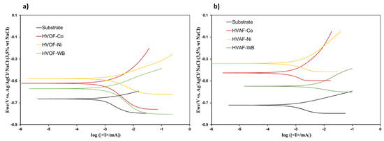 On the other hand, the comparison of the Icorr values between HVOF-Co & HVOF-Ni and HVAF-Co and HVAF-Ni shows that these coatings present similar corrosion rates under open circuit potentials. Despite of this, when the potential is shifted to the anodic region, these coatings clearly show a different behavior since HVOF-Co and HVAF-Co coatings show a lower current intensity value than the Ni-based coatings over a potential region approximately of −340 and −185 mV, respectively. This data suggests that under polarization conditions, the Co-based coatings will corrode more slowly than the Ni-based coatings. Considering that this kind of coating is supposed to act as a protective barrier between the environment and the substrate, this allows for the conclusion that the HVOF-Co and HVAF-Co coatings will show higher corrosion protective performance than the rest of the coatings studied.