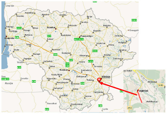 The location in Pagiriai (around 20 km from Vilnius, the capital city of Lithuania) was selected for constructing the Test Road section (Figure 1 and Figure 2). The location fulfills all conditions required for the experiment: it has a sufficient heavy traffic volume, is located in an open terrain, has no horizontal plan curves or vertical curves in the longitudinal section, and distinguished by the same humidity conditions within the whole route of the road section. The road leads to gravel quarries where one traffic line is used by loaded and another by unloaded traffic [17,18,19].