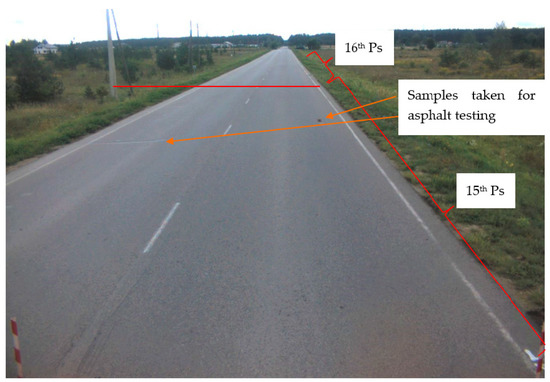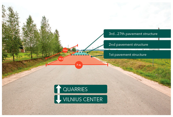 According to Technical Construction Regulation STR 2.06.03:2001 Automobile Roads, parameters for the transverse profile of the Test Road correspond to the 3rd category (2 traffic lanes, pavement width—7 m, and roadside width—1 m) and the 3rd class of the PS (ESAL of 100 kN = (0.8–3.0 million). The length of the Test Road makes 710 m in total and consists of 27 different PSs [17,18,19].