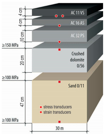 Various materials were used for a number of the layers of the Test Road structures (Table 1). The thickness of every PS was selected according to the reference PS made of 4 cm asphalt wearing course AC 11, 4 cm asphalt binder course AC 16, 10 cm asphalt base course AC 32, a 20 cm base course produced of crushed dolomite (0/56) and a 47 cm frost blanket course produced of sand (0/11) (No. 19). Asphalt wearing course include AC 11, SMA 11, SMA 11 PMB (polymer-modified bitumen), and Confalt, where AC 11 is an asphalt wearing course affected by heavy loads; AC16—an asphalt binder course affected by heavy loads, AC 32—an asphalt base course affected by heavy loads, and SMA 11 PMB—stone mastic asphalt wearing course with polymer-modified bitumen and affected by heavy loads [17,18,19].