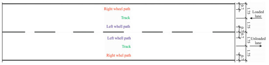 Road pavement parameters (as rut depth) were measured using mobile laboratory RST-28. Rut depth measurements were performed every 1 m in right and left wheel paths of loaded and unloaded lanes (Figure 5). A total of 30 values for each rut of the PS. The average depth of the right and left rut was calculated for each PS of loaded and unloaded lanes (Section 4.3).