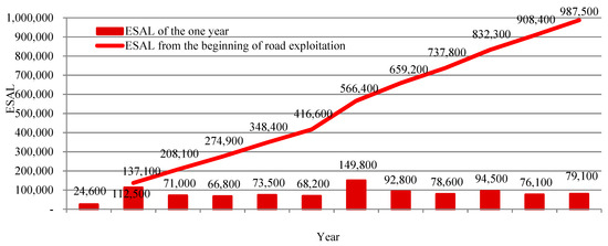 - For the 11-year period of exploiting the Test Road, the passing heavy vehicles caused an impact of 987,900 ESAL. Considering historical data and anticipated trends towards an increase in traffic, the average annual growth rate of ESAL makes 90,000. It is expected that the critical ESAL level of 3.0 million can be achieved during the period of the 20th–22nd years of the Test Road.