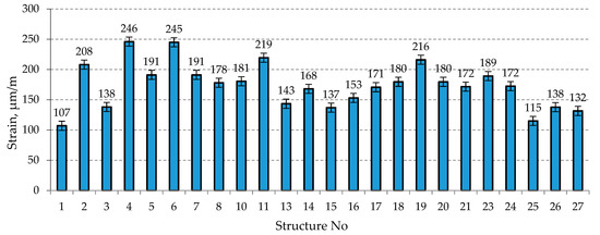 The highest strain values of PS asphalt base courses (Figure 7) were determined in PS No. 2 (208 µm/m), No. 4 (246 µm/m), No. 6 (245 µm/m), and No. 11 (219 µm/m). The lowest strain values of PS asphalt base courses (Figure 7) were established in PS with thicker asphalt layers (22 cm in total), i.e., No. 1 (107 µm/m) and No. 25 (115 µm/m, PS with a geosynthetics (20/20 kN/m) between sub-base and frost blanket course).