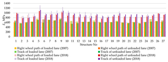 The difference of E0 modulus between five highest and five lowest bearing capacity results was established up to 20% (average of E0 modulus of the PSs with the highest bearing capacity was 980 MPa in 2018, while with the lowest one was equal to 828 MPa) (Figure 13). The difference of E0 modulus between five highest and five lowest bearing capacity of the structures identified in 2008 was up to 12% (average of E0 modulus of the PSs with the highest bearing capacity was 733 MPa in 2008, while with the lowest one was equal to 660 MPa).