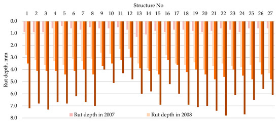 Following the first year of the road operation, the determined rut depth made 2.0–4.0 mm on average in LLRWP (Figure 11). The measured data (in 2018 autumn) of asphalt wearing course LLRWP rut depth was detected greater on average 3.4 mm (including AC11 asphalt mix) and 2.7 mm (including SMA11 and SMA11 mixed with PMB) since 2007. Subsequently, rut depth increased from 0.1–1.0 mm each year. It was observed that ruts formed during the first year of operation of the Test Road. The depth of ruts formed during the first year was 30%–50% of rut depths set in 2018. This indicates a high material compaction during the first few years of operation and, it can be concluded that the asphalt wearing course may be subject to a higher requirements, i.e., the limit value of the compression ratio should be 98% instead of 97% or for designing the mixes of the asphalt wearing course, Marshall specimens should be formed with a higher number of hits on both sides, i.e., 2 times for 75 hits instead of 2 times for 50 hits.