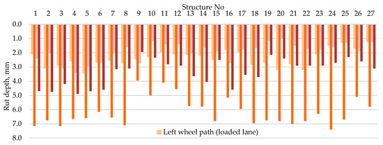 The results in Figure 11 present that the mean LLRWP rut depth was 60%–400% (PS No. 9 and No. 25, respectively) greater than the LLLWP rut depth and 10%–70% (PS No. 16 and No. 19, respectively) greater than the ULRWP rut depth. The average LLLWP rut depth was 5%–70% (PS No. 13 and No. 20, respectively) greater than the ULLWP rut depth (Figure 11). It follows that heavy vehicles driving to quarries (by unloaded lane) were less loaded (rut results were lower) on PSs than those turning from quarries (by loaded lane, where rut results were greater). The use of different materials (Table 1) on each PS has also a great impact on rut depth formation. Other factors were assumed to be constant (Section 4.3).