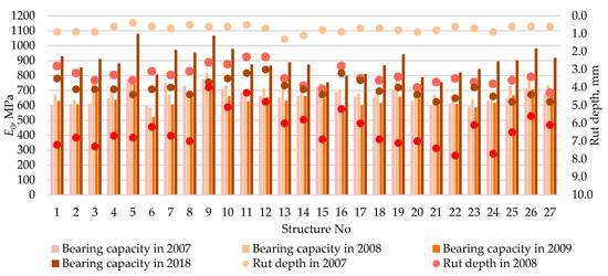 The conducted investigations showed that following 11 years of the Test Road exploiting the structure, the lowest established bearing capacity of 754 MPa hardly affected rut depth, which is clearly evident from Figure 13 showing 5 structures having the highest and 5 structures having the lowest bearing capacity with the resulting rut depth. Meanwhile, in 2007, the initial bearing capacity of the structures was 560–600 MPa (780 MPa at maximum).