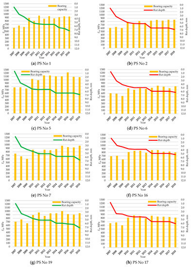 PS based on base course of 10 cm aggregate—milled asphalt concrete and 10 cm 0/32 crushed dolomite (No. 5, Table 1) have an average of 15% higher bearing capacity (Figure 8) than other PS. This trend is observed when comparing the annual bearing capacity data.