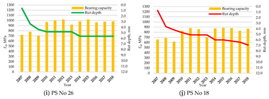 Variation of bearing capacity and rut depth in time of the PS having the highest (a,c,e,g,i) and the lowest (b,d,f,h,j) bearing capacity.