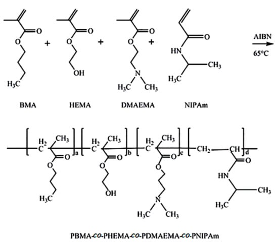 Butyl methacrylate (BMA), Hydroxyethyl methacrylate (HEMA), 2-(Dimethylamino) ethyl methacrylate (DMAEMA) and N-isopropylacrylamide (NIPAm) were provided by Shanghai Aichun Biological Technology Co., Ltd. (Shanghai, China). Azobisisobutyronitrile (AIBN) was purchased from Tianjin Damao Chemical Reagent Factory (Tianjin, China). Absolute ethanol and n-hexane were provided by Tianjin Fuyu Fine Chemical Co., Ltd. (Tianjin, China). Acetone, anhydrous toluene, hydrochloric acid, and sodium hydroxide were provided by Tianjin Komiou Chemical Reagent Co., Ltd. (Tianjin, China). All reagents were analytical grade and used without other treatment.