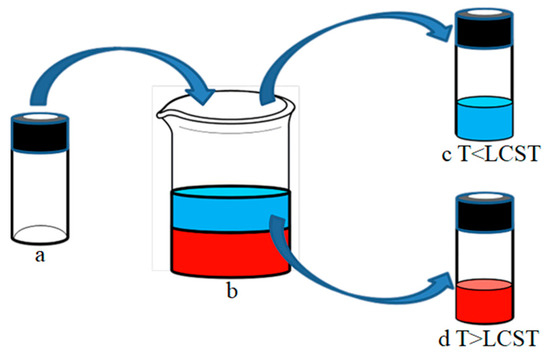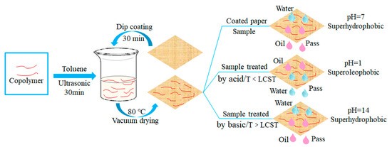 First, 1 g of the temperature and pH dual-responsive copolymer prepared above was added to 20 g of anhydrous toluene, and then dispersed and reacted under ultrasonic conditions for 30 min to form a uniform and stable copolymer solution. Then, the spare paper (German duni wood pulp paper, size 40 × 40 cm2, gram weight about 60 g) was cut to a size of 3 × 3 cm2. Acetone, anhydrous ethanol and deionized water were used to wash the paper under ultrasonic at 25 °C at room temperature and dried at 60 °C. Then the clean and the dry paper was soaked in the prepared copolymer solution for 30 min to form a superhydrophobic coating on its surface. The coated paper was put into a vacuum drying oven, and dried for about 2 h at 80 °C to obtain a superhydrophobic paper with dual-responsiveness of temperature and pH. The paper preparation process and the oil–water separation effect in response to temperature and pH are shown in Figure 2. The lower critical solution temperature (LCST) of the paper in the picture will be determined below.