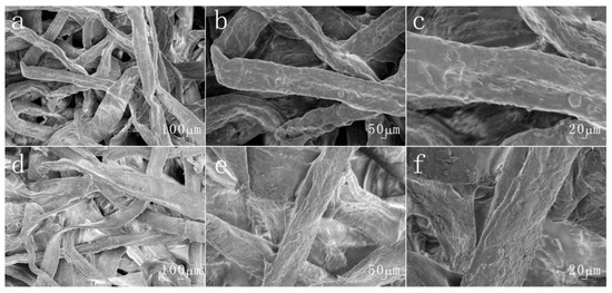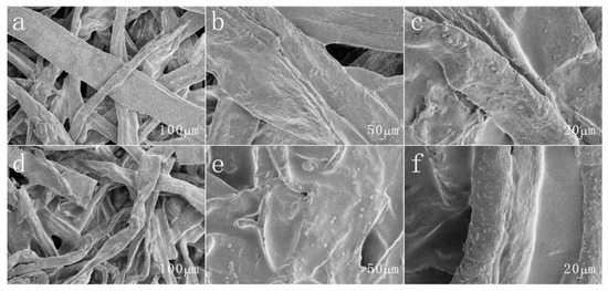 To study the effect of copolymer PBMA-co-PHEMA-co-PDMAEMA-co-PNIPAm on the surface morphology of paper, the surface morphology of raw paper, and modified paper soaked by copolymer solution were observed and analyzed by using SEM images with different magnifications. Figure 4a–c are the original paper samples. On the whole, it can be seen that the surface of the paper fiber before the modification has only a small amount of impurities attached, and it is almost smooth and flat, and there is no obvious rough structure similar to protrusions. Figure 4d–f are the modified paper samples. It can be clearly seen that the surface of the paper fiber after coating with the copolymer has raised structures and wrinkles, which are no longer flat and smooth, and has become very rough. Compared with the relatively smooth surface of the original paper, it can be preliminarily judged that the modified paper is obviously rough because it is coated with a temperature and pH dual-responsive copolymer. Besides, by observing Figure 4d–f, it is found that the surface of the modified paper fiber becomes rough only. Its structure and outline have not changed significantly, and the inherent distance between the fibers are still maintained. It ensures that the good mechanical and air permeability properties of the paper will not be changed. This shows that the surface coating of the original paper will not damage the fiber structure of the paper and affect some of its properties. Conversely, the paper can be coated with functional substances on the surface, which make it rougher and enhances the hydrophobic properties of the paper.