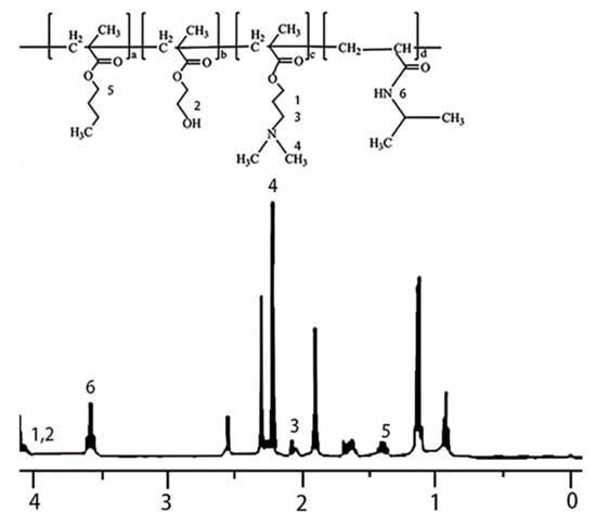 As shown in Figure 7, the molecular structure of the temperature and the pH dual-responsive copolymer were characterized by 1H NMR. The –CH2 peak of PBMA was observed at 1.4 ppm. The peaks observed at 2.23 and 2.3 ppm correspond to –N–(CH3)2 and –N–CH2 of PDMAEMA. The groups obtained at 4.07 ppm contributed to –CH2OH and –CH2 linked to an ester group of PDMAEMA. The peak observed at 3.68 ppm was due to –CH–(CH3)2 of PNIPAm.