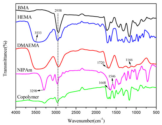FTIR was used to test and characterize the monomers used in the copolymerization reaction and the finally synthesized copolymer with dual-responsiveness. The chemical structure of the product was observed to further demonstrate the success of the polymerization. Figure 8 show the infrared spectra of the monomers BMA, HEMA, DMAEMA, NIPAm and the synthesized dual-responsive copolymer used for polymerization, respectively. In Figure 8 (green curve) the copolymer spectrum, the absorption peak at 2958 cm−1 corresponded to the stretching vibration of –CH in the monomers of BMA, HEMA, NIPAm and DMAEMA. The peak near 3533 cm−1 was ascribed to the stretching vibration of –OH in the HEMA monomer. The characteristic absorption bands at 1166 and 1720 cm−1 corresponded to the C–N and C=O tensile groups in DMAEMA, respectively. The stretching and bending vibration peaks of N–H were clearly observed at 3298 and 1546 cm−1, which were the typical absorption bands of NIPAm. The peak near 1668 cm−1 was attributed to the C=O stretching vibration of NIPAm [41]. Through analysis, it was found that the main characteristic peaks of these monomers existed at the same wavelength in the spectra of the copolymer with dual-responsiveness. This phenomenon further indicated that the copolymer has been successfully synthesized from the microscopic point of view.