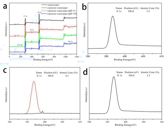 (a) XPS spectra. N 1s core level of (b) copolymer coated paper, (c) modified paper treated with acid, and (d) modified paper treated with an alkali, respectively.