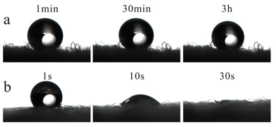 After the LCST of the modified paper was determined, the temperature response of the paper surface under different conditions could be tested by measuring the contact angle of the paper treated at different temperatures. The specific method was as follows: two successfully modified superhydrophobic papers were treated at two temperatures below and above the LCST, respectively. One of them used an ice bath to treat the paper at 15 °C, while the other used a hot bath to treat the paper at 55 °C. As shown in Figure 13a, the contact angle of the paper surface changes with time below 55 °C. When the paper was above the LCST, the initial state of the paper was superhydrophobic, and its contact angle was 161°. After 3 h, it remained superhydrophobic, and the contact angle at this time was still greater than 150°, which was 157°. As shown in Figure 13b, when the paper was processed at 15 °C, the surface contact angle of the paper reached 158° at the beginning, which was a superhydrophobic state. After a few seconds, the water droplets on the surface of the paper began to slowly penetrate the paper, and the contact angle decreased gradually. Within 30 s, the water droplets had completely penetrated the surface of the paper, and the water contact angle had reduced to 0°. At this time, the paper successfully transformed into hydrophilic paper. The results of the temperature response test show that the modified superhydrophobic paper has a theoretical temperature response performance. It is superhydrophobic paper under conditions higher than the LCST and it will transform into superhydrophilic paper when it is below the LCST.