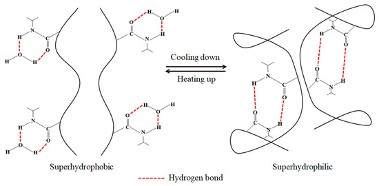 PNIPAm can realize the transition between superhydrophobic and hydrophilic states when the temperature changes, because the hydrogen bond between the amide group of PNIPAm and the water molecule has changed. When the temperature is lower than LCST, the C=O and N–H groups in PNIPAm form intermolecular hydrogen bonds with water molecules. Under the action of this hydrogen bond, the two groups above will be very closely combined with water molecules and the polymer exhibits hydrophilic properties. In addition, the effect of hydrogen bond will lead to hydration expansion of PNIPAm, which provides sufficient power for the PNIPAm chain segment on the surface to cover other polymers, thus making PNIPAm dominant and contributing to hydrophilicity on its surface. On the contrary, when the temperature reaches above the LCST, as the temperature increases, the hydrogen bonds between the molecules will gradually weaken, making the hydrophobic interaction between the isopropyl groups more obvious. When the temperature rises to a certain degree, the hydrogen bond between the C=O and N–H groups and water molecules will be broken, and an intramolecular hydrogen bond will be formed. The PNIPAm at this time shrinks compared with the state under the LCST, causing it to be dehydrated and collapsed. In this way, its hydrophobic groups and other hydrophobic polymers used in polymerization reaction (such as PBMA and PDMAEMA, etc.) are exposed, so that the surface of the prepared polymer shows superhydrophobic characteristics. The analysis of the temperature response mechanism is shown in Figure 14.