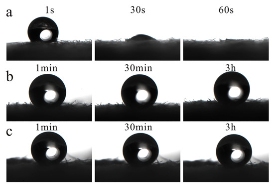 Similarly, the pH-responsive performance of the prepared superhydrophobic paper was tested to verify whether it successfully possessed a pH-response. Figure 15a shows that the initial contact angle of the paper was greater than 150° and up to 159° after the paper was infiltrated by an acidic solution with pH 1. However, after a short time, the water droplets on the surface began to permeate the paper slowly. The second picture of Figure 15a shows the state of water droplets on the surface of the paper after 30 s. As the time continued to increase, the water droplets on the surface of the paper disappeared completely after 1 min. The contact angle was obviously dropped to 0°. After soaking the modified superhydrophobic paper in a neutral solution with a pH of 7 and an alkaline solution with a pH of 14, the original superhydrophobic state had been maintained for 3 h. The test results of pH responsiveness show that the superhydrophobic paper prepared in this research had good pH responsiveness. After acid treatment, the paper would gradually change from a superhydrophobic state to a hydrophilic state. But under neutral and alkaline conditions, its superhydrophobic state could remain unchanged and had a good stability. This shows that the superhydrophobic paper can flexibly switch between superhydrophobic and superhydrophilic states when the external pH value changes.