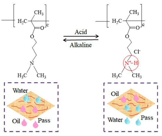 In this study, poly (2-dimethylamino) ethyl methacrylate (PDMAEMA) was selected as the pH-responsive polymer. It is a sensitive polymer material with pH response. PDMAEMA has ionizable tertiary amine groups. This allows it to undergo a protonation or deprotonation transition when the external pH value changes, so as to react accordingly [49,50]. When the prepared copolymer is under an acidic environment, the tertiary amine group in PDMAEMA will be protonated to form a positively charged ammonium group (QA+). The molecular hydrogen bonds between the groups will combine with the surrounding water molecules to form a layer of water molecules on the surface, which increases the surface energy of the material and makes the material exhibit hydrophilic properties. At the same time, this layer of water molecules can block the entry of oil and make the material exhibit oleophobic properties. When the material is in a neutral and alkaline environment, the hydroxyl group in the solution attacks the nitrogen atom of N+–H and releases a proton at the same time. The chloride ion in the quaternary ammonium salt is removed, and the ionizing group can be deprolongated. At this time, the surface wettability of tertiary amine groups is dominated by hydrophobic groups, and hydrophobic interaction becomes the major force. This leads to the superhydrophobicity of the copolymer. In other words, the protonation and deprotonation reactions of PDMAEMA cause a significant change in the wettability of the material surface. The analysis of the pH-response mechanism is shown in Figure 16.