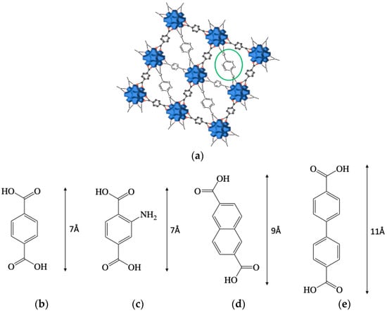 Isoreticular UiO-metal-organic frameworks (MOFs): (a) schematic representation of UiO-66. Zirconium oxide cornerstones are shown in blue, and one of the ligands is highlighted in green; (b) terephthalic acid; (c) amino-terephthalic acid; (d) 2,6-naphthalenedicarboxylic acid; (e) 4,4’-dibenzoic acid.