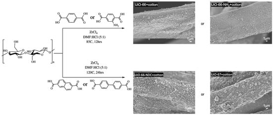 In a prior work, we reported on the functionalization of cotton with UiO-66 using carboxylated cotton substrates []. In this manuscript, we focus on the isoreticular and isostructural growth of UiO-66 while bypassing the carboxylation step. We also show the effect of different reaction conditions on the properties of cotton fabrics functionalized with UiO-based MOFs. We grew the UiO-based structures without the aid of a binder, which was previously required to anchor Zr ions to textile substrates []. The optimized reaction pathways and reaction conditions are summarized in Figure 2 along with SEM images illustrating that the resulting cotton fibers are conformably coated with a thin layer of a UiO-based MOFs.