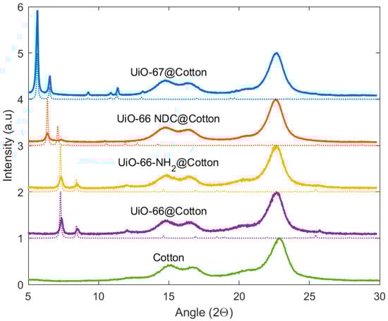 Solid lines: measured X-ray diffraction patterns for cotton+UiO-67 (blue), cotton+UiO-66-NDC (red), cotton+UiO-66-NH2 (yellow), cotton+UiO-66 (violet), and cotton (green) specimens. In dotted lines are the respective simulated diffraction patterns of a corresponding MOF structure.