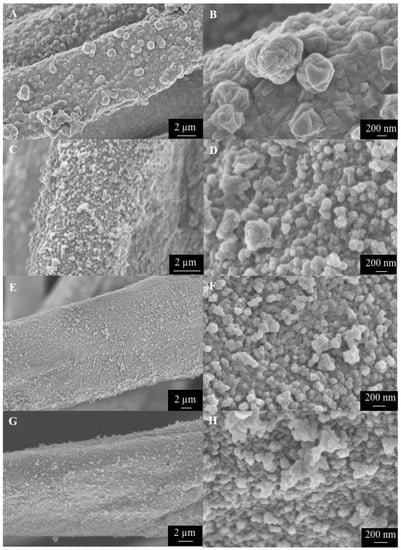 SEM images taken at higher magnifications confirm the coverage of the cotton’s surface (Figure 4B,D,F,H). Cotton+UiO-66-NDC, cotton+UiO-66-NH2, and cotton+UiO-66 specimens show a lower dispersion in particle size than the cotton+UiO-67 specimen. This observation can be explained on slower nucleation and growth kinetics. While MOFs with smaller ligands grow fast, the generation of nucleolus is instantaneous, and all these nucleoli grow simultaneously. Larger ligands hence generate a more polydisperse crystalline system [].