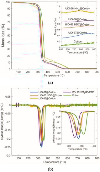 (a) Thermogravimetric analysis of the cotton fabrics coated with UiO-Based MOFs showing the full temperature range from 30 to 900 °C. Insert: magnification for the 650 to 900 °C temperature range. (b) Differential Thermogravimetric analysis spectra. Insert: magnification for the 250 to 400 °C temperature range.