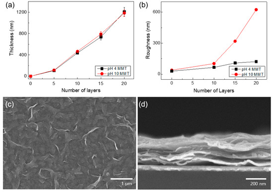 (a) Thickness of (MMT-PEI)n deposited with MMT at pH 4 and pH 10, and the pH of PEI was fixed at pH 10. (b) Roughness of (MMT-PEI)n deposited with MMT at pH 4 or pH 10. Representative SEM images of (c) the surface and (d) cross section of (MMT-PEI)n=10 assembled with MMT at pH 4. (See Figure S1 for the SEM images of the coating deposited with MMT at pH 10.).