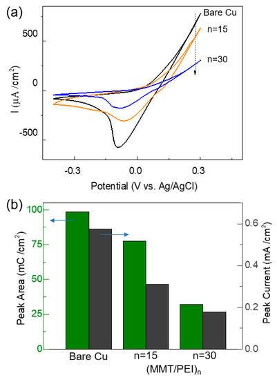 A copper electrode was coated with the LbL coatings made of a pH 4 MMT dispersion, and the corrosion caused by the reaction with chloride ions was investigated. The CVs of the bare copper and the coated copper electrodes in Figure 4 show that an oxidation current and a reduction current occur, respectively, in the voltage range of −0.4 to 0.3 V. The reduction peak is between −0.08 to −0.06 V. This is due to the reaction of copper with chloride ions (Cu + Cl− <-> CuCl + e−) [15,16]. Bare copper has the largest reduction peak value and cathodic peak area. In the case of the coated electrode, it can be seen that the values decrease. When the number of layers is 15, the peak value is reduced to about a half, and when the number of layers is 30, it is reduced to about a third. This is close to the level that is reduced (1/2 ~ 1/10) when copper is coated with a common organic inhibitor for copper corrosion such as imidazole [16]. This demonstrates that corrosion due to small ions such as Cl− can be suppressed considerably with this type of LbL coating.