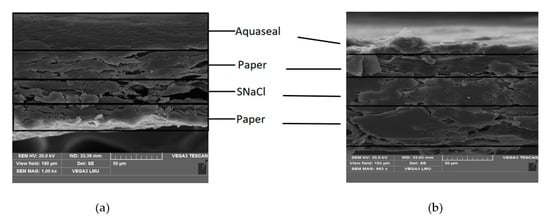 Scanning electron microscopy (SEM) is the most widely applied technique to characterise packaging material layer size and morphology. Figure 2 shows a SEM image of an Aquaseal coating on the surface of the modified packaging material. The SEM image revealed that the NaCl/starch (SNaCl) layer was homogeneously distributed throughout the paper surfaces for both packaging materials before and after storage. It was observed that after storage, the package layers (except the Aquaseal layer) were wider than the layer of the package before storage. Figure 2b shows “swollen and bloated” layers. This may suggest that the layers absorbed water.